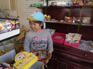 財布に150円入れて、欲しい駄菓子を選びますが、金額と欲しいものが合わず、悩んでしまう子どももいましたが、一人ずつレジに