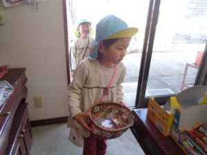 袋に入ったお菓子を探しますが、すぐに探してくる子、中々探せず焦ってしまう子どもと、それぞれに宝探しを楽しんでいました。