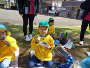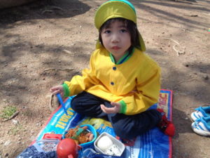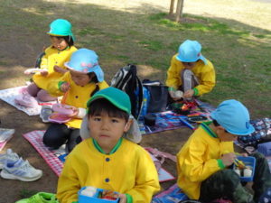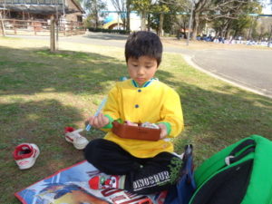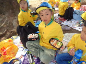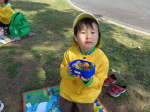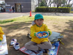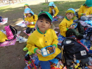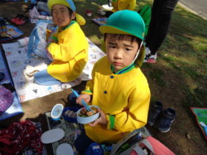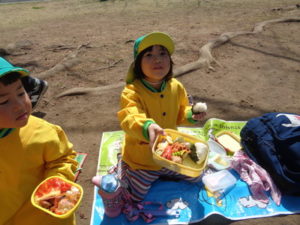 子ザルや、カバ、サイを見てから、広場に戻ってお待ちかねのお弁当タイムになりました。