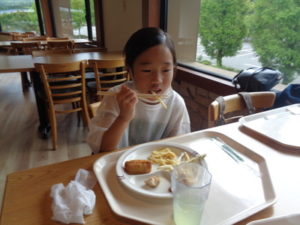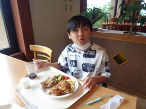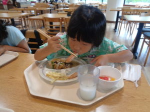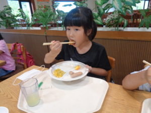 たくさん遊んだ後は、お待ちかねのバイキングレストランへ行き、自分の好きなものを好きなだけ取ってきて