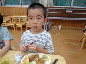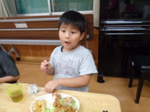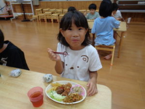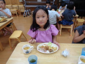 夕食は給食の先生に作ってもらったお子様ランチで、「とってもおいしそう」と喜ぶきりんさんでした。