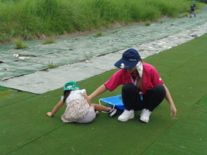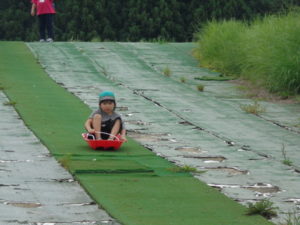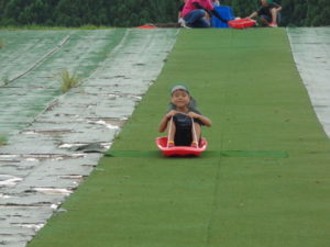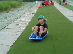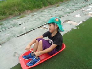 草スキーでは、乗り方のコツを教えてもらいましたが、中々うまく滑ることが難しく、