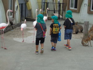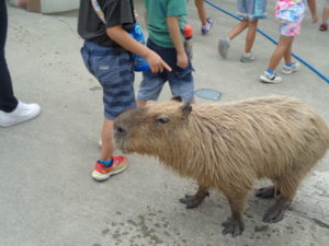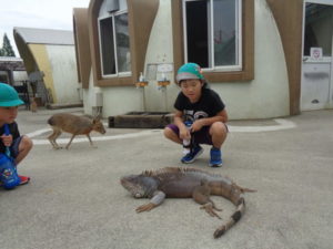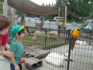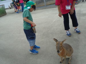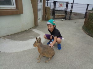 月廻り公園を後にして、ファームランドへ行き触れ合い動物園で珍しい動物に触れ、驚いた様子や、