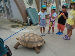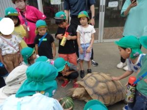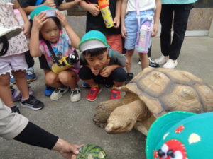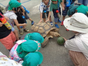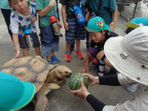 怖くて大きな声を出してしまう場面もありました。陸ガメがスイカの餌を食べる様子では、スイカを