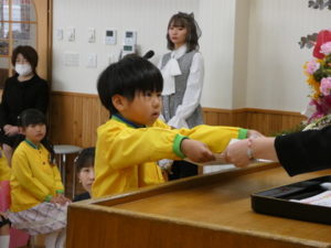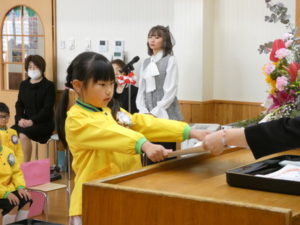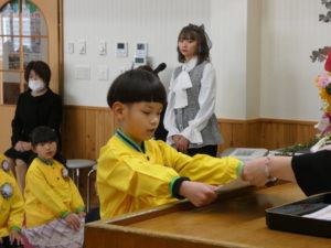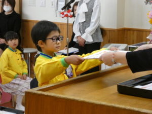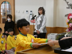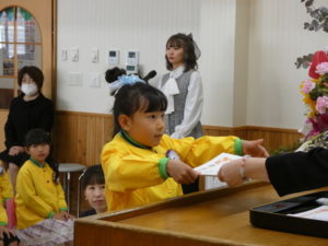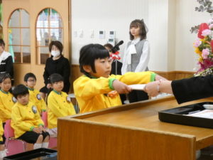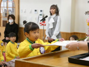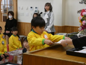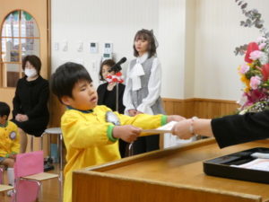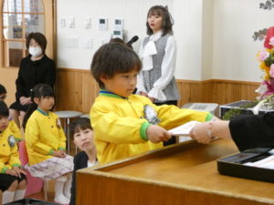 卒園児入場の際はやや緊張した様子でしたが、証書授与になり、名前を呼ばれると大きな声で返事し、園長先生から卒園証書をもらい、その後保護者へ将来の夢を言ってプレゼント渡しをしました。