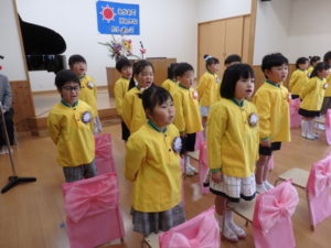 園長祝辞では、卒園児の小さかった頃の事を話され大きく育ち巣立つ事を喜びとして伝えられました。