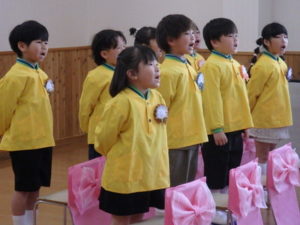 お別れの言葉では、今年1年間の行事、活動を思い出し、一人一人が立派に話す事が出来ました。続く「ずっと忘れない」の歌の歌詞は、家庭、保育園での思い出を歌ってあり、聞いている保護者、職員も思わず涙する場面もありました。