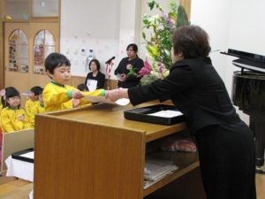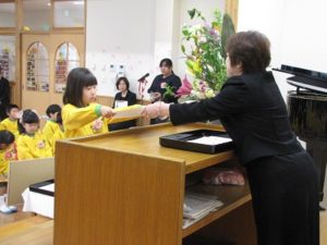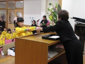一人ひとり卒園証書の授与を行い、来賓の方の祝辞を頂いたり、