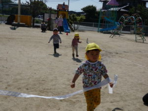 来月に運動会を控え、遊びの中でかけっこやリレーなど取り入れて、運動会の練習としています。