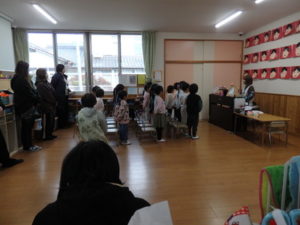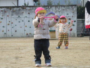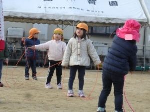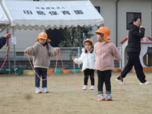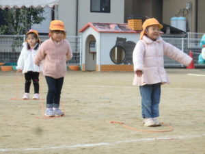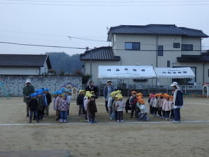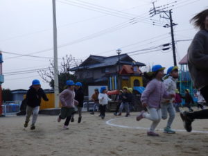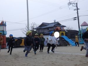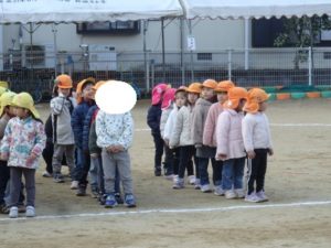 この日は、朝から小雨が降っていましたが、登園するころには雨も止んで、幼児クラスは予定通り、園庭に出て体操、マラソンを行いました。参観の保護者の方も、寒そうにされていましたが、子ども達の頑張りに、感心されていたようです。