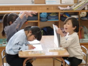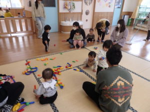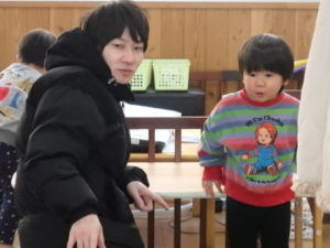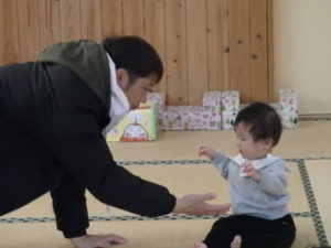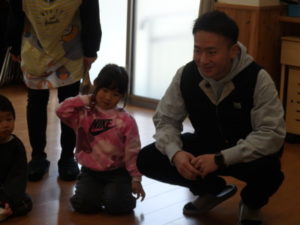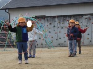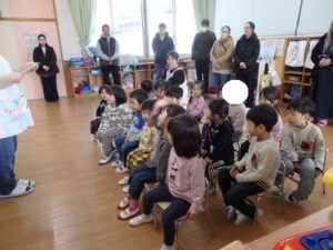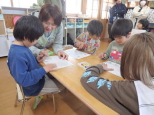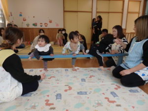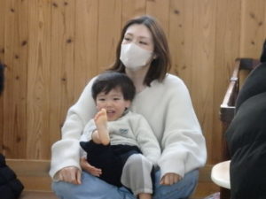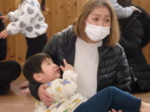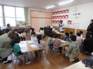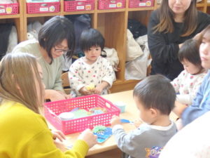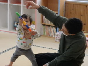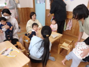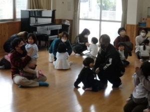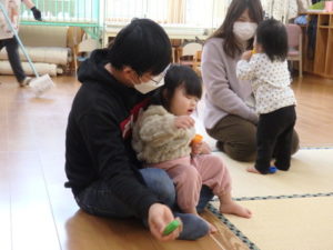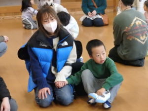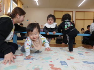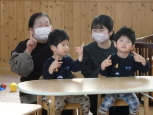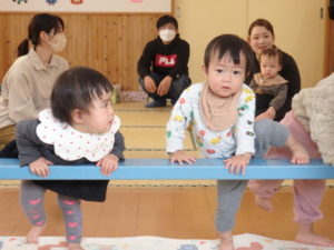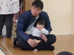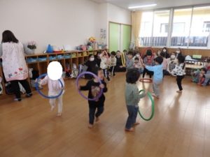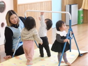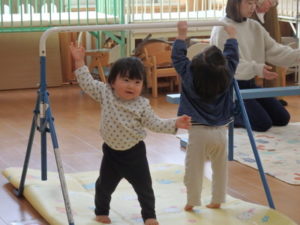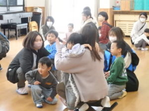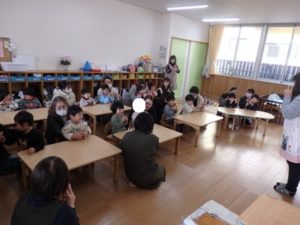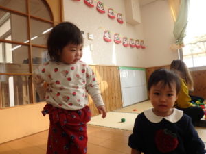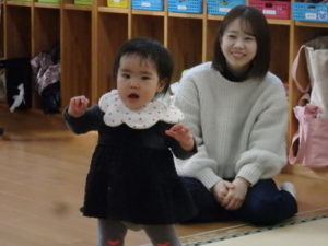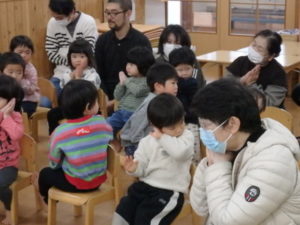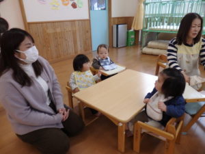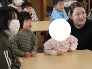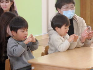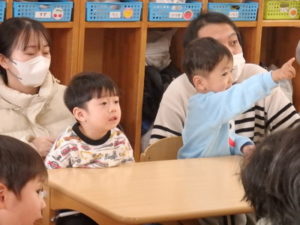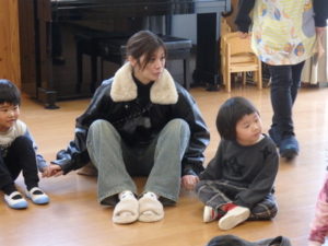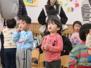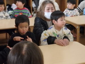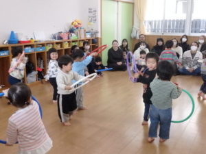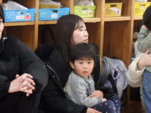 1月の保育参観では、「朝の身支度」や「排泄」「手洗い」など、いつもの生活の流れの中で、少し誇らしげな表情を見せながら取り組む子ども達の姿が見られました。朝のおやつ後は、月間絵本を楽しみ、フープを使った運動遊びや楽器遊びにも嬉しそうに身体を動かしたり、音を鳴らしたりしながら、楽しい時間を過ごしました。