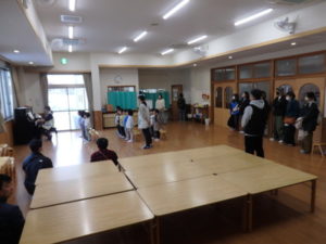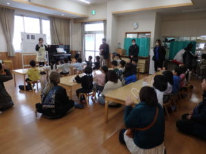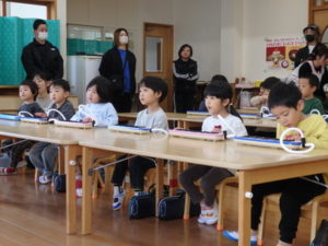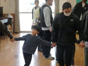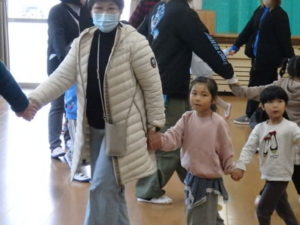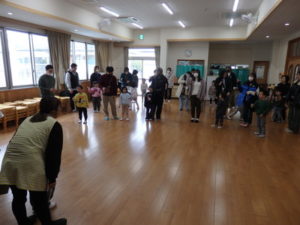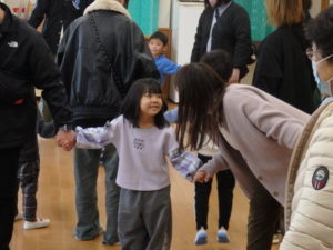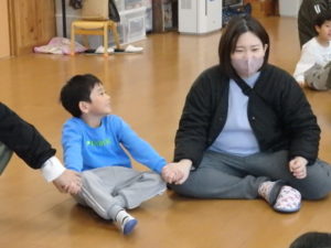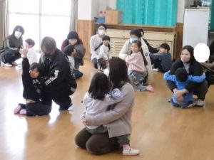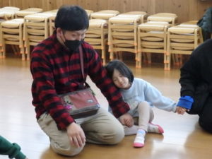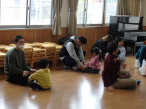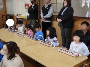 くま組は、鍵盤ハーモニカの練習と、ゲーム遊びをしました。鍵盤ハーモニカの練習では、保護者の皆さんに見られ少し緊張気味でしたが、大きな声で歌ったり待っている間は音を鳴らさないお約束を守って取り組むことができました。ゲーム遊びでは、「猛獣狩り」「かごめかごめ」「こおり鬼」をしました。保護者の方にも参加してもらい、いつもより少し難しいお題やルールでしたが、仲良く楽しんで参加する姿が沢山見られ、大盛り上がりでした❣❣