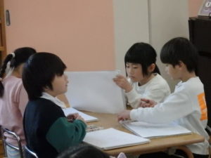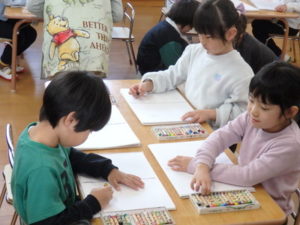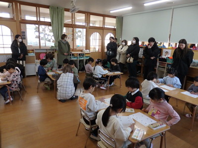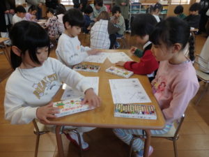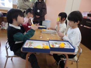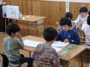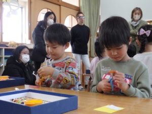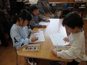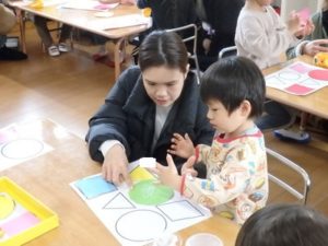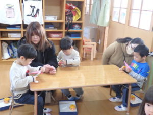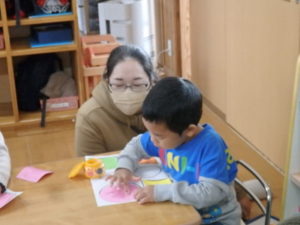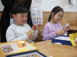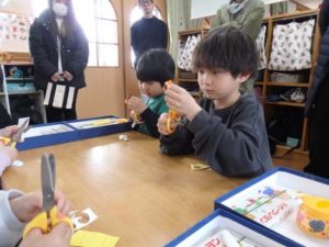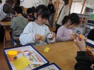 今日の保育参加は、知育ワークと製作をしました。知育ワークでは、ひらがなと数字、左右の勉強をしました。椅子に座り、保育者の話を聞き、しっかりと問題を解くことができていました。小学校に向けて、45分しっかり座る練習ができました。その後は、製作をしています。節分に向けて、豆入れを作りました。今までよりも、小さなパーツをハサミで切りましたが、しっかり細かい所まで集中して切る姿が見られました。個性豊かな、可愛らしい豆入れが出来上がり、子ども達も嬉しそうでした。節分が楽しみですね😄。沢山成長した姿を見ていただくことができて良かったです。