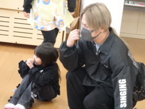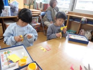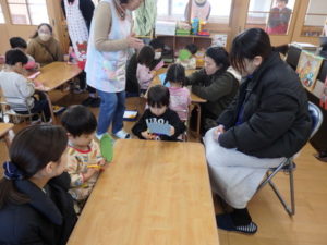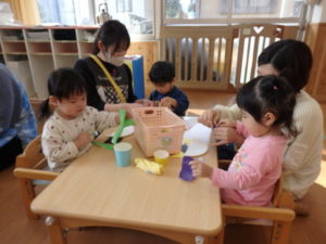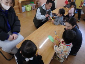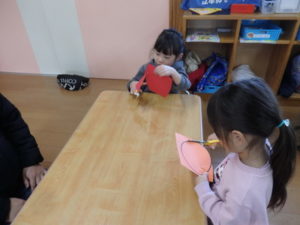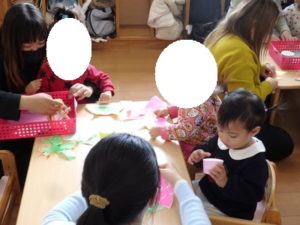 りす組は、節分の製作で、お面と豆入れを保護者の方と一緒に作りました。最初は、いつもと違う環境に涙する姿も見られましたが、段々といつもの姿が見られるようになりました。お家の方と一緒に、折り紙をビリビリ破ったり、糊で目や鼻・鬼の角をつけて、オリジナルの鬼が出来上がりました。