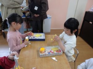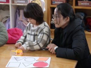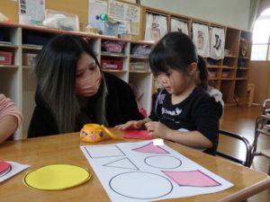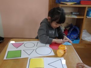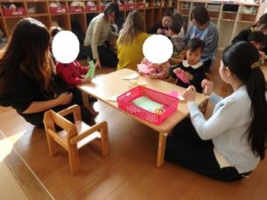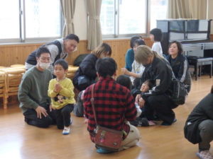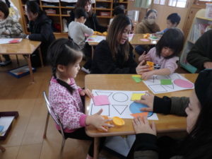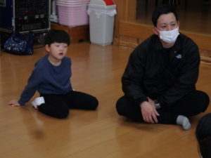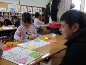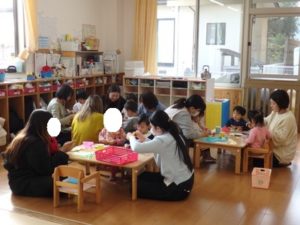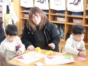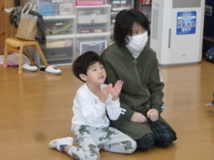 ぱんだ組は、外でのなわとびの練習から見て頂きました。回してぴょんがだいぶ出来、なわとび結びも徐々に出来るようになってきている子どもが増え見てもらって喜んでいました。活動は、はさみを使って〇、△、□、◇の形を連続切りで切る練習を行いました。保護者は横に座り、切る様子を見られていて、時々ハラハラしたような表情をされている保護者もいましたが、みんな上手に切る事が出来ていました。今日は、おとうさん、おかあさんに、いい所を見せたくていつもより落ち着いて過ごす事が出来ていて、「よくできました怪獣」が出てきて頭をなでてくれ、喜ぶ顔が見られました。