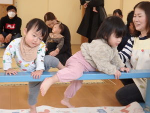 鉄棒やマット・技巧台・平均台に触れながら、保育者と一緒に体を動かすことを楽しむ姿が見られました。保護者の方の姿が見える事で安心する一方、甘えたい気持ちが高まり、涙する場面もありましたが、保育者に抱かれながら気持ちを切り替え、少しずつ活動に参加する姿が見られました。一人ひとりの気持ちに寄り添いながら、成長を感じられる時間となりました。