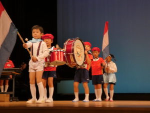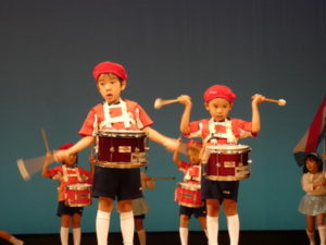 5歳児きりん組のマーチングでオープニングを飾りました。ドラムメジャーの合図で鼓笛隊が出てきて、隊形移動をしての演奏は難しかったと思いますがみんな、周りを見ながら自分の立ち位置を確認していたようです。最後はハートのマークになって終了し子ども達も満足気な様子でした。