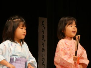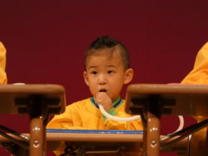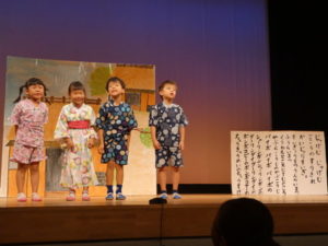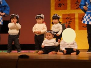 5歳児きりん組は、田島伝統の神楽二剣の舞では白い着物を着て、田島菅原神社神楽保存会の方の笛太鼓の演奏に合わせて、舞いました。「じゅげむ」の劇をしました。落語家がじゅげむの噺を進めていくといった設定で、劇中では、「じゅげむじゅげむ~」と長い名前のセリフを拍子木の音に合わせて言い、面白可笑しく演じていました。