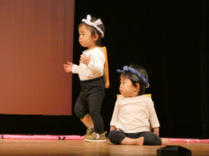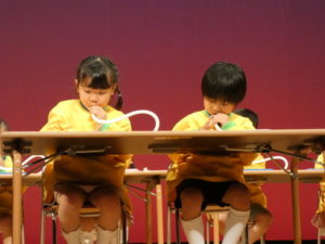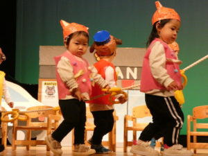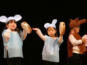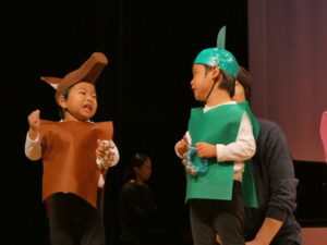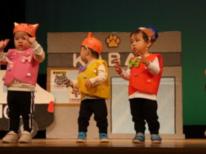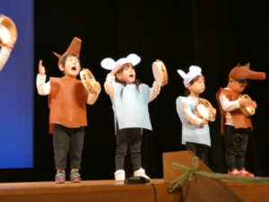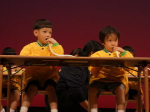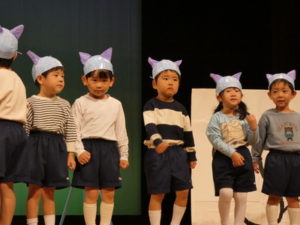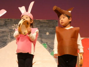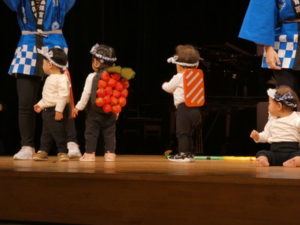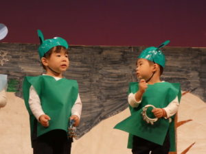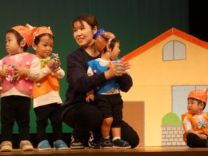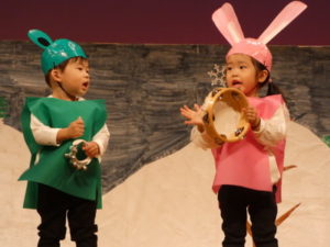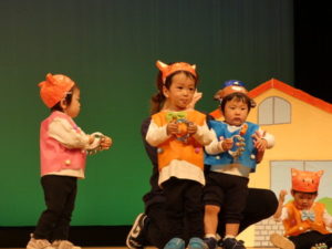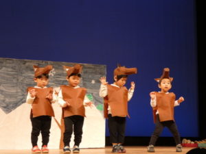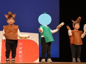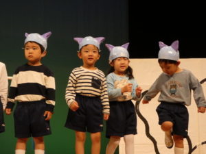 4歳児くま組は「はらぺこあおむし」の劇をしました。英語を交えての劇は大きな声でセリフを言いあおむしの仕草もかわいく出来ました。鍵盤ハーモニカの演奏では「勝利をたたえるうた」を演奏しピアノに合わせてしっかり指を動かして弾いていました。