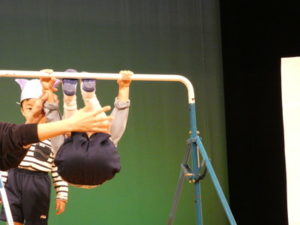 3歳児ぱんだ組は20匹の猫に扮して、平均台渡り、鉄棒、を使っての運動、マットではブリッジ、バランス、アザラシといったストレッチを猫たちの自慢大会で披露ししました。最後に一人ずつ数字を言って「すうじのうた」を歌いました。