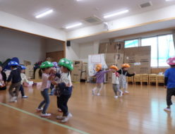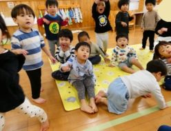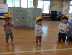 もうすぐ発表会で、今日も劇あそびと楽器遊びの練習をしました。みんなで、セリフの練習を頑張りました。その後は、マットを使用しての運動遊びをしました。「足」「おへそ」と、言われた部位をマットにつける運動遊びを楽しみました。少しずつ寒くなり、寝具も毛布へと・・・。