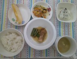 今日も天気が良かったですね♪今日の給食は、赤魚の照り煮でした。柔らかくて食べやすかったので子ども達はぺろりと完食でした☆おにぎりは子ども達人気のワカメおにぎりでした。