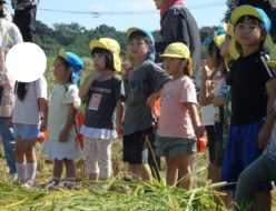 今日は、朝から戸外遊びを時間いっぱい楽しみました。その後、秋祭りに向けて盆踊りの練習をしたり、発表会に向けて各クラス練習をしました。お昼から、西小学校の稲刈り🌾の見学に行きました。