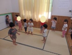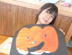 10月の製作をしました。自由画帳いっぱいに絵の具を塗り、カボチャの形に切って、目や口・鼻を折り紙で作り、自分の好きな形に切って張り付けました。個性豊かなカボチャが完成しました♪体操教室では、ゲーム遊びをしています。
