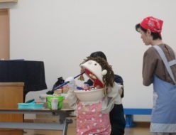 今日は、手洗いをしておやつをいただきました。おやつも美味しそうに食べ、元気いっぱいです。活動では、劇あそびを楽しみました。お部屋では、ままごとをしたり、ひも通しに夢中になったりと、それぞれが好きな遊びを見つけて過ごしました。