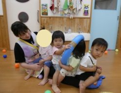 今日はプールに入り、おもちゃで沢山遊び、朝からさっぱりした子ども達でした。その後、発表会で合奏をするので、楽器遊びをしました。グループに分かれて、リズムに合わせ、楽器をならす練習をしましたが、難しかったようです。楽しみながら、合奏の練習ができたらと思います。