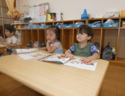 今日は、月刊絵本を見て、じっくりとページをめくりながら楽しむ姿が見られました。お話の中のイラストを指差して「これなに?」と興味を持つ子もいましたよ。室内では、ままごと遊びや組み立てブロックを楽しみました。