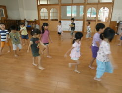 今日は、くま🐻組・きりん組🦒さんでリトミックを行いました。久しぶりのリトミックピアノ🎹の音をしっかり聞き、動けるかな?と心配でした。ピアノ🎹の音で動きを変えるのが難しい子どももいましたが、身体を大きく動かして楽しむ姿が見られました。