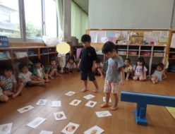 今日はプールに入った後で、平均台をして、保育者が言った食べ物や道具の名前を取るという遊びをしました。物の名前、料理の名前など、まだ知らない言葉が沢山あるようなので、少しずつ覚えていってほしいと思います。