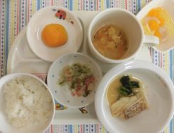 今日も日差しが強く、暑い日になりましたね。給食は、魚の味噌煮でした。今日のお魚はサバ!副菜にはチキンサラダでした。ササミ、きゅうり、トマト、キャベツトマトが入っているので彩りもきれいでした。おやつは、フルーツ白玉でした。