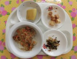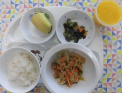 今日は天気が変わりやすい1日でしたね。今日の給食は、夏にぴったりの酢料理でした。夏バテしやすい夏には、カリッあげた魚に甘酢でさっぱりと頂きました。おやつは、子ども達大好きなオレンジケーキでたくさんおかわりしてくれました。