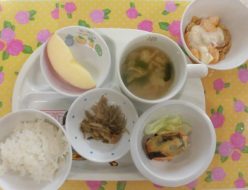 今朝の雨は土砂降りで、道路の雨水がすごかったですね。給食は、ひじきの炒め煮でした。ひじきや切り干し大根、人参など栄養豊富なものがいっぱい!おやつはメロンパンでした。