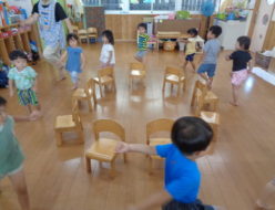 今日は、初めて椅子取りゲームをしました💺しっかりとルールの説明を聞き、ゲームに取り組みました。最初は椅子に座らないお友達もいて、保育者の声掛けで座っていましたが、段々理解してきて、イスに座れず、泣いている子どももいました。