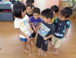 縄跳びとフープを使って、じゃんけんゲームをしました。縄から落ちない様に、バランスをとる子ども達。ケンケンが難しく、お友達と抱き合う子もいました。そして、じゃんけんでは何度も何度もあいこになり決まらず・・・😁最後まで行って負けてしまい、悔しがるこの姿も見られました。