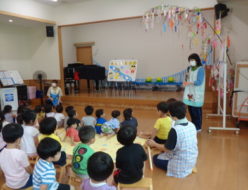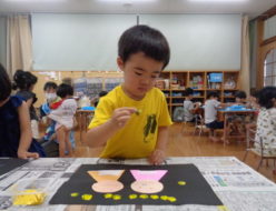 今日は、体操教室後みんなで植えたオクラを使ってスタンプ遊びを行いました。先日、織姫・彦星の製作をした周りにペタペタと・・・。オクラがどんな形になるのか、興味津々の子ども達でした。