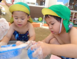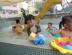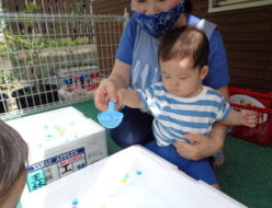 やっと雨が上がりましたね。九州南部は梅雨明け・・・熊本も、本日梅雨明けしましたね🌞ひよこ組さんは、テラスに出て"金魚すくい”をして遊びました。