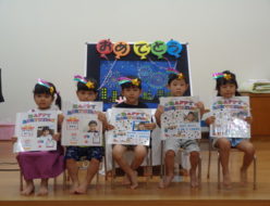 今日は、7月生まれの誕生会でした。今月はオリンピックがあるので、1964年の東京オリンピックの入場曲に合わせて、誕生児が入場しました。その後、部屋を暗くして、花火の絵をブラックライトで照らし、プチ花火大会を見ました。