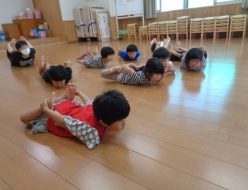 今日も暑い日でしたね🌞今日は、ランチルームにてリトミックをしました。ピアノのリズムに合わせてゆっくり歩いたり、速足などを行った後“うさぎや金魚”で体ほぐし・・・。