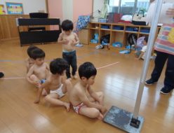 朝から雨がひどく降りましたが☔・・・子ども達は元気に登園し、友達と室内遊びを楽しんでいましたよ😀今日は、身体測定を行いました。服の着脱が少しずつ上手になってきたぱんだ組🐼さんです❢身長計の前に並び、自分の順番が来るのを楽しみにしていましたよ。