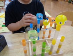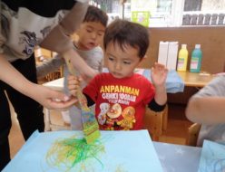 こいのぼり製作で、はじき絵をしました。クレヨンで楽しくお絵描きをし、水で薄めた絵の具にすごく興味を持っていました。皆集中して取り組んでいました。最近きたキッチンで、ままごと遊びもしています。