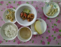 今週も暑い日が続きそうですね。給食は、ミートスパゲッティでした。トマト缶と一緒に煮込み、ケチャップなどで味付けしました。おやつは、メロンパンでした。ホットケーキミックスと豆腐を合わせて作りましたよ。