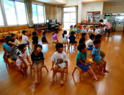 今日は、きりん・くま組合同でゲーム遊びをしました。まずは、みんなが大好きな椅子取りゲームで、音楽がいつ止まるかソワソワしながら楽しむ姿、負けて涙する子どもも数名いました。その後ハンカチ落としゲームをしました。