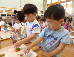 プランターで育てたピーマンが大きくなり、沢山収穫ができました。そのピーマンを使って、餃子の皮でピザ作り🍕をしています。ケチャップをぬり、ピーマン・ソーセージ・コーン・チーズ🧀を自分達でトッピングしました。