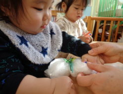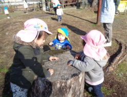 ☆ぱんだ組☆鬼のお面作りの仕上げをしました。先週、絵の具で塗った紙袋に色紙を貼り、毛糸を使って髪を付けました。真剣に頑張っていました♪☆りす・ひよこ組☆今日は、ひよこ・りす組で一緒に温泉公園まで散歩に行きました。仲良く遊ぶ事が出来ました。