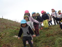 くま・ぱんだ組(♬お散歩へ♬)くま・ぱんだ組は、散歩に行きました。日頃歩かない畑の土手や、畑と畑の段差を駆け降りたりと、体幹を使った歩きになりました。牛舎では、牛の数を数え牛の観察をし、信号のある道路を渡り交通指導も行いました。
