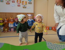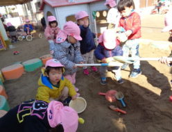 今日は、大きなかぶの劇あそびをした後帽子を被り、自分で靴下・靴を履いて元気に出ていってすべり台、三輪車、コンビニカーなど自分で遊びたい物を見つけて仲良く友だちと遊んでいたりす組さんでした。